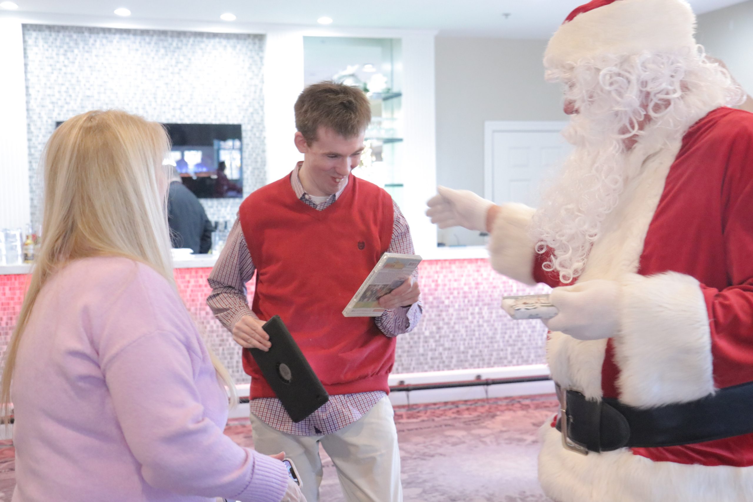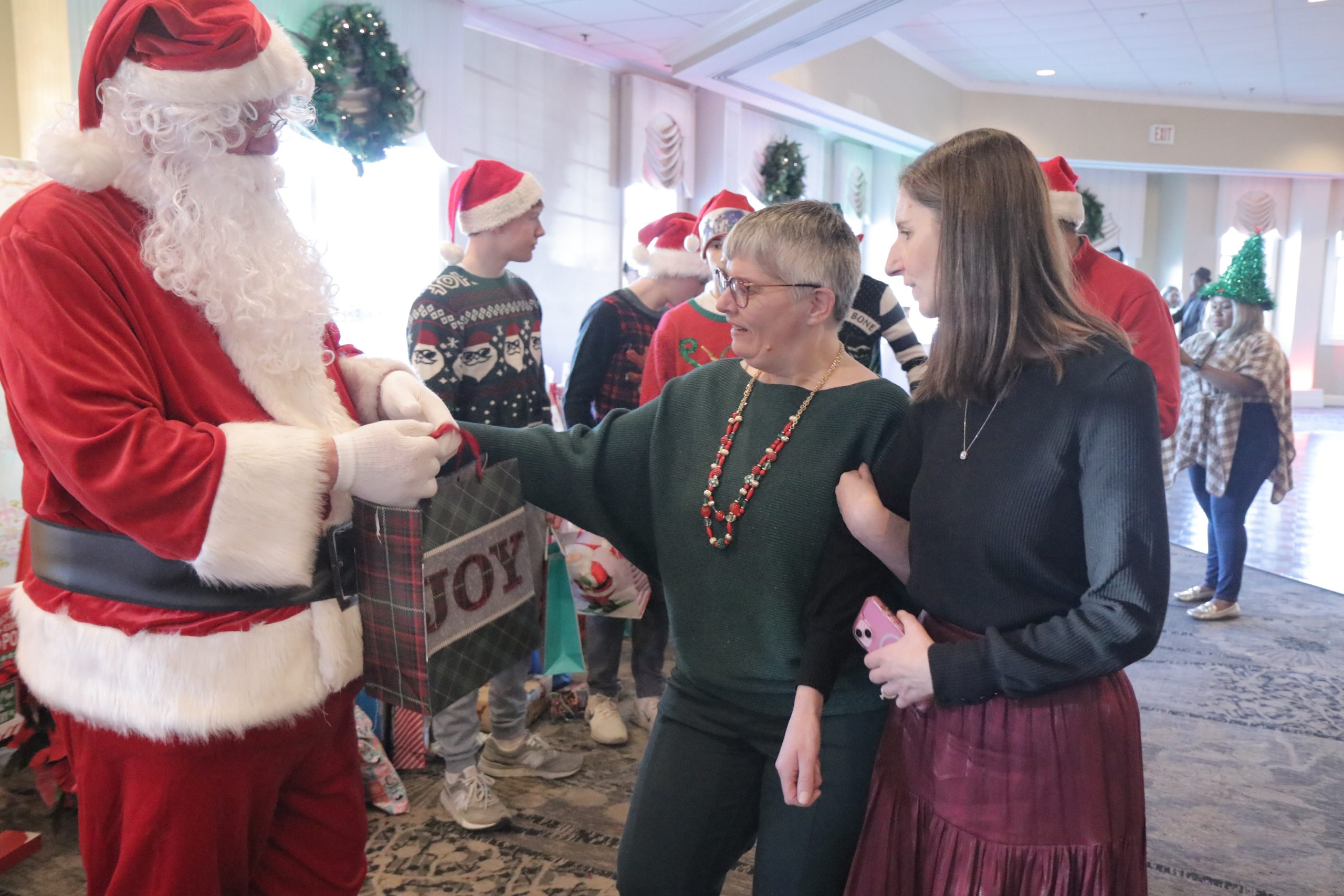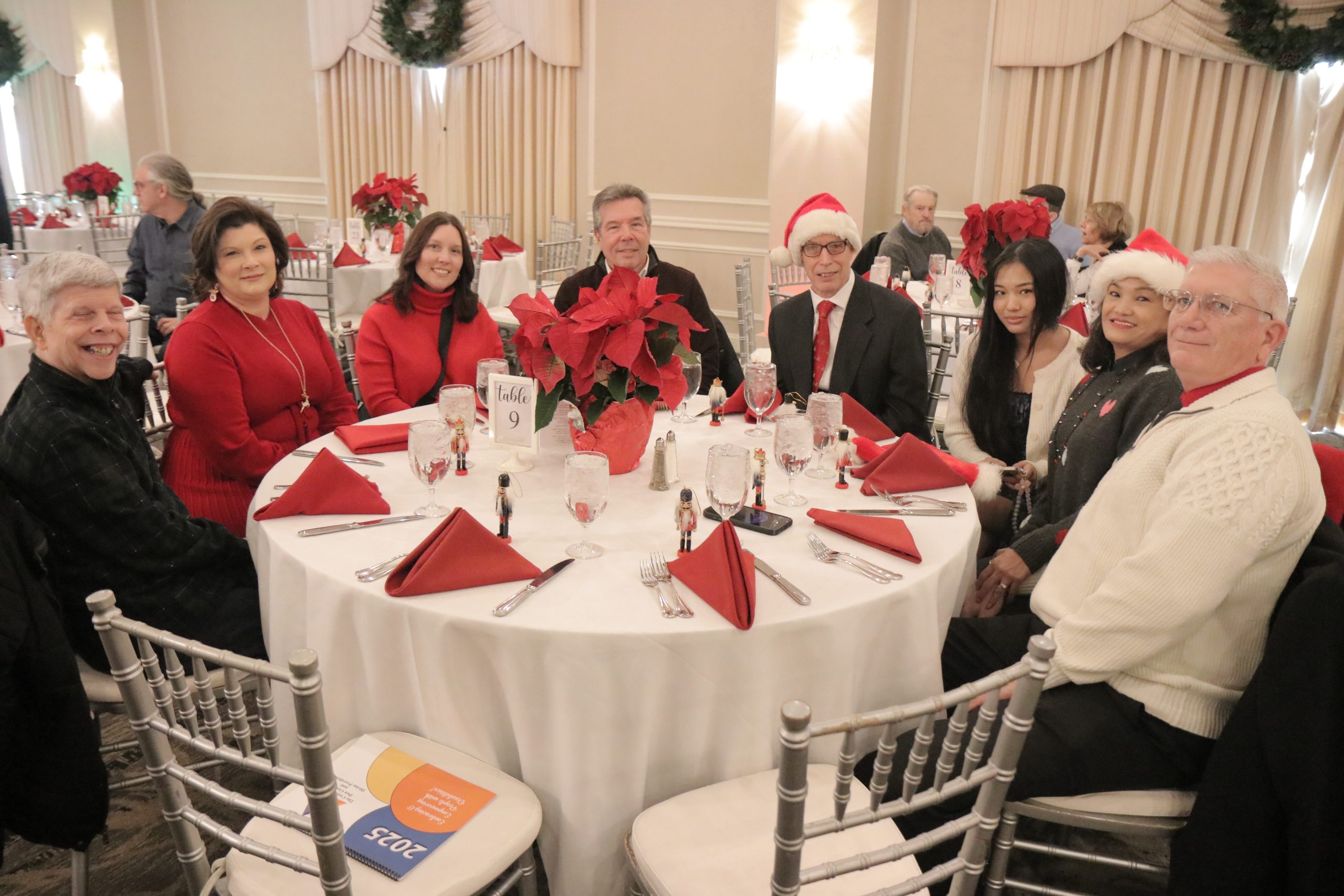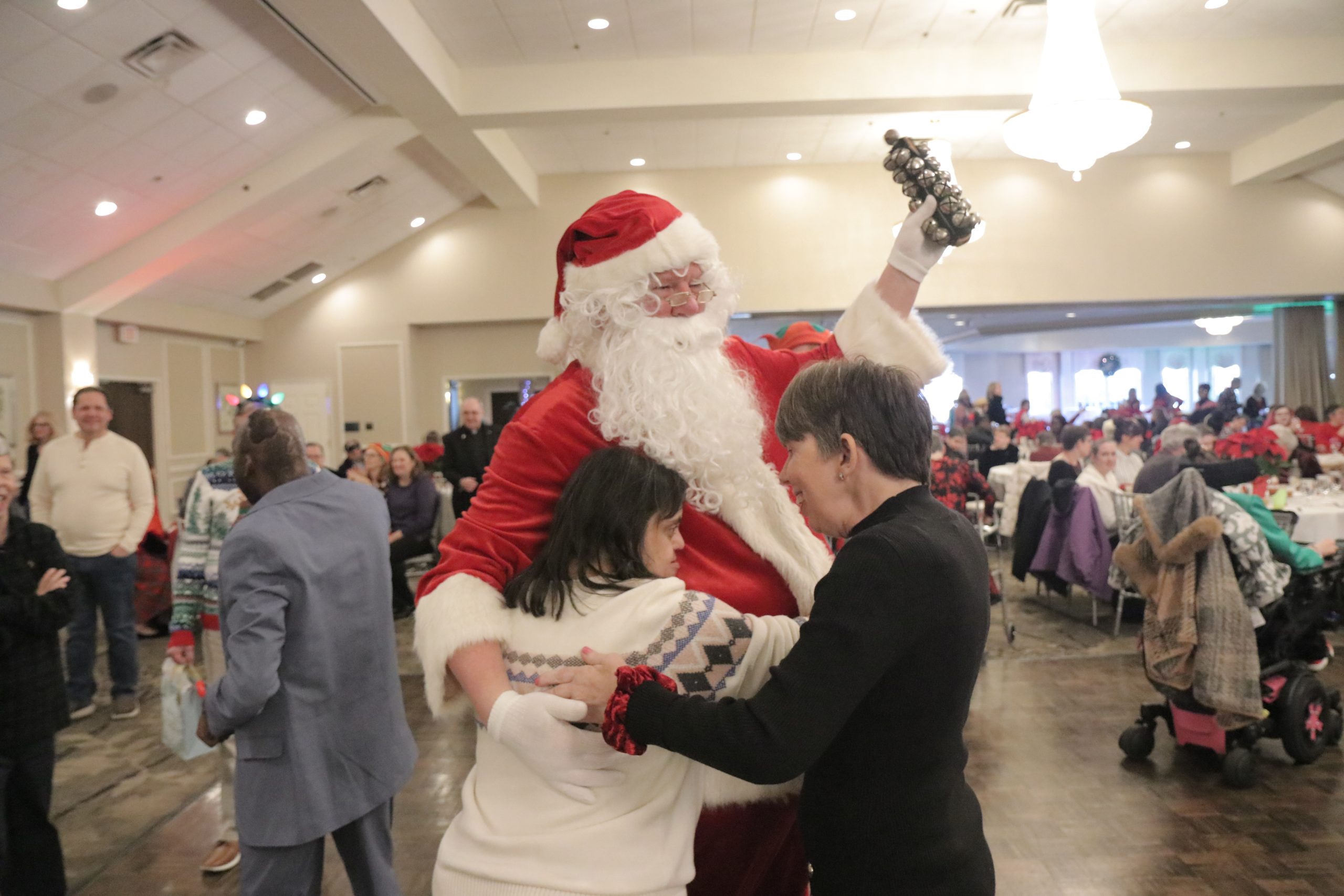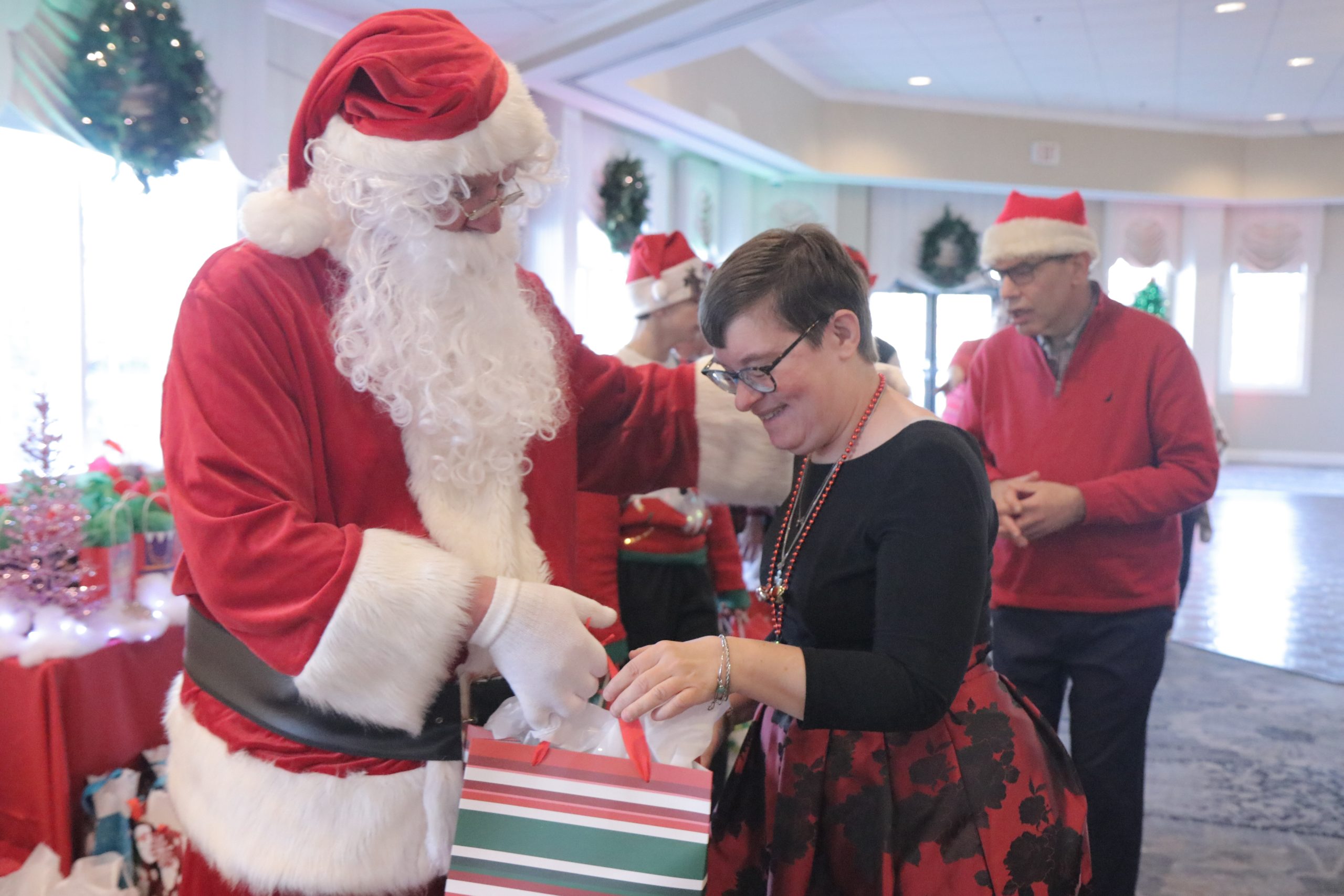 The event included Christmas carols performed by the Saint Francis of Assisi School Choir (Delaware County), dancing, a seated luncheon, a distribution of gifts, and a special visit from Santa.